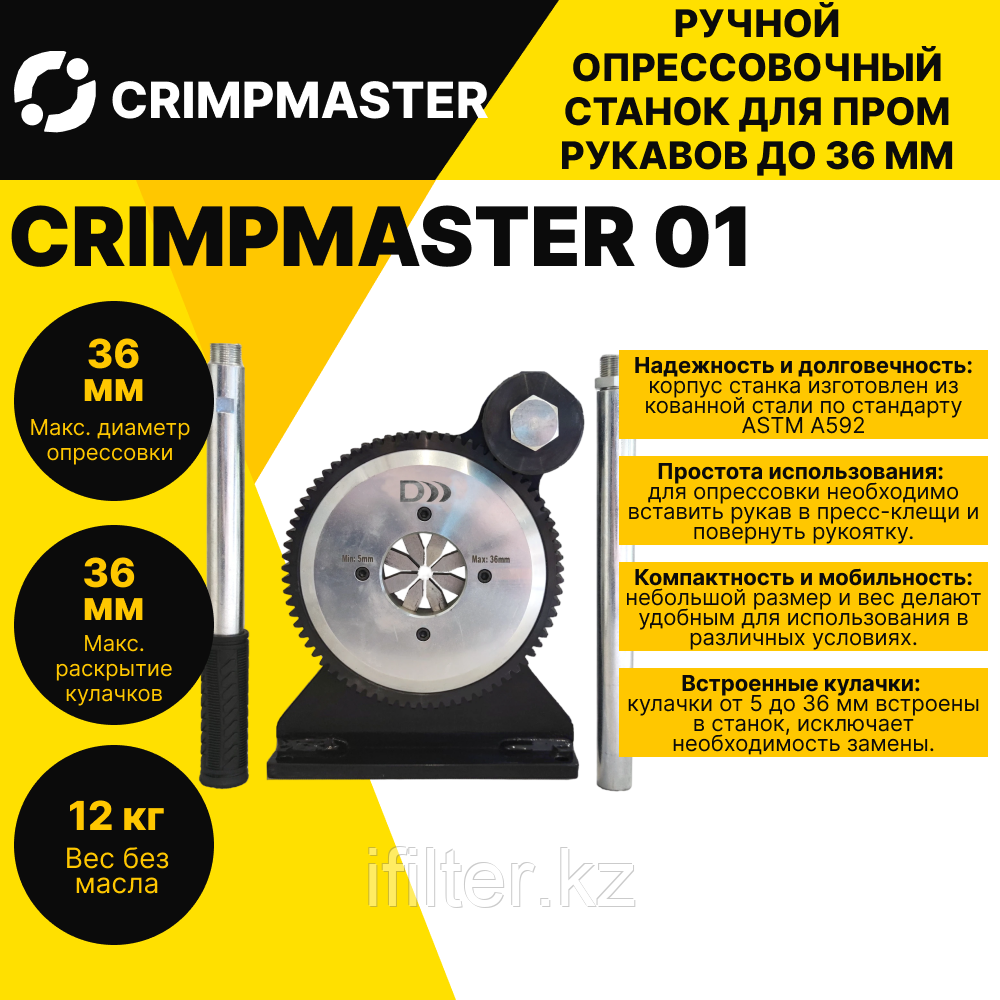 Отправка с 02 декабря 2025CRIMPMASTER 01 – Недорогой и надежный станок для обжатия промышленных рукавов. Компактный размер, отсутствие разборных частей, малый вес. Кулачки для обжима от 5 до 36 мм встроены в станок.